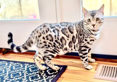 Sterling is a handsome silver Bengal stud with champion lines. He has thick outlines and a lovely pattern as well as a bougie look. Silvers are the most recent TICA approved Bengal color. Sterling is a large, sweet boy who loves to cuddle up next to you.